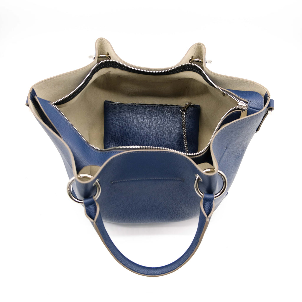 BEATRICE è un'ottima scelta per chi cerca un tocco di eleganza e funzionalità. Tutta in vera pelle martellata con interno scamosciato, ha due manici e anelli dorati. Questa borsa di ampie dimensioni è accessoriata con chiusura a zip superiore, una pochette in pelle estraibile e una tracolla sganciabile, offrendo versatilità e praticità. L'accessorio perfetto per ogni occasione.